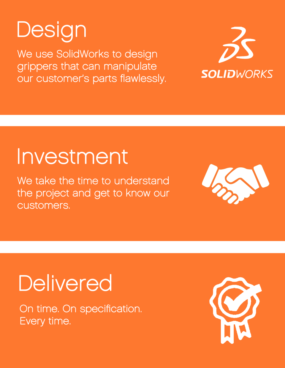 Creating the perfect robotic gripper to compliment your application perfectly is a capability that HMK can supply. We utilise SolidWorks, industry standard 3D design software, along with mechanical expertise gained from over 35 years in industry so as to design grippers that can manipulate our customer’s parts flawlessly.