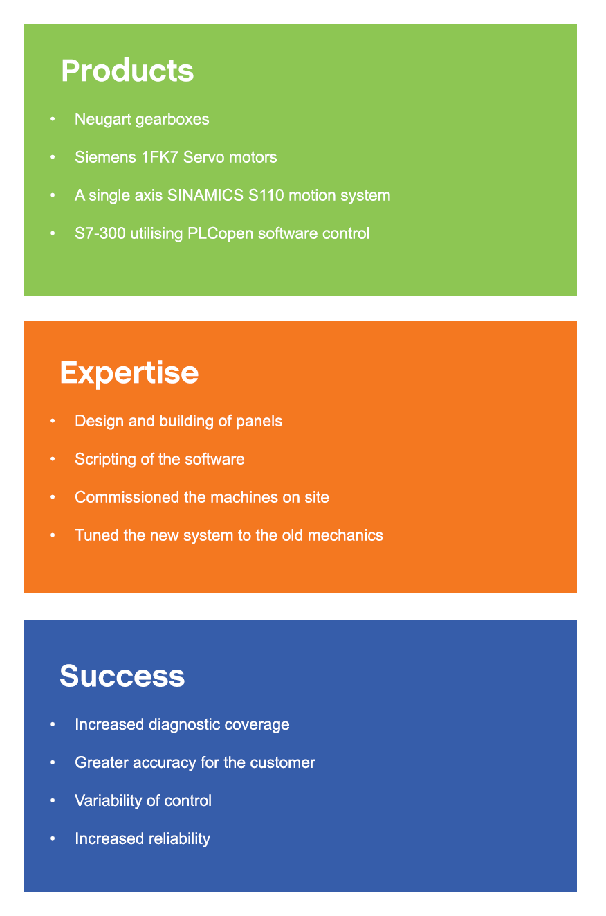 Numerous benefits to the customer were achieved, comprising of - Increased diagnostic coverage; high precision gearboxes coupled with Siemens servo motors, giving the customer greater accuracy; variability of control and increased reliability.