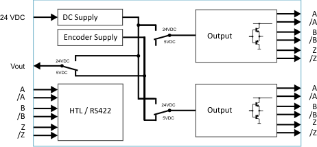 1 encoder input programmable with format A, /A, B, /B, Z, /Z [TTL / RS422] or optionally A, B, Z [HTL]
