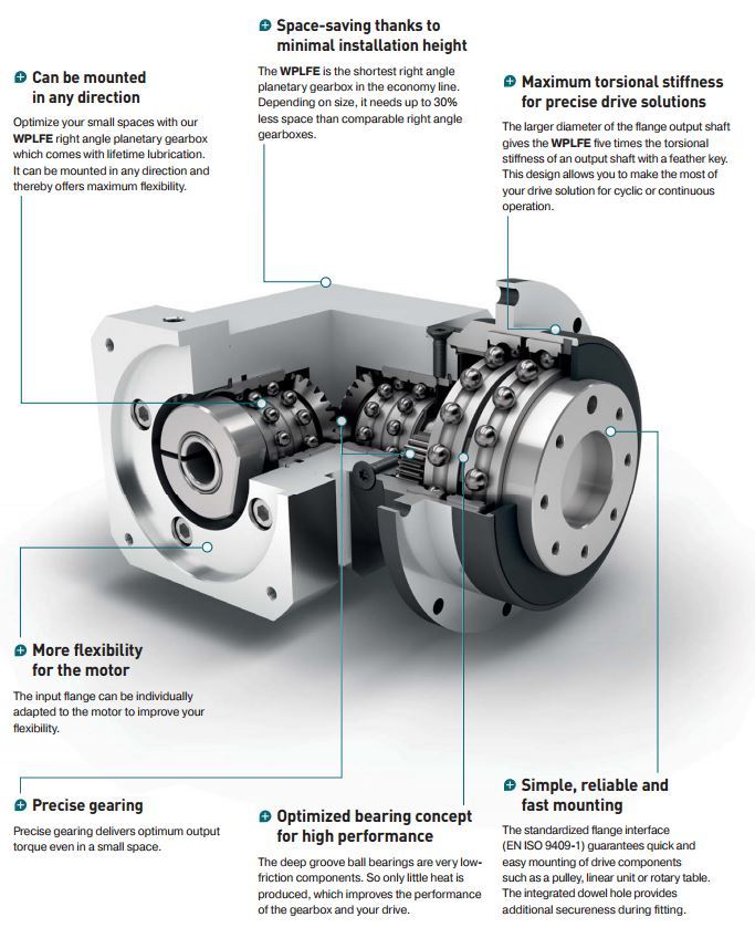 The WPLFE is the shortest economy gearbox in the range —saving you up to 30% more space. This space-saving gearbox can also be more quickly and securely installed with its standardised flange interface.