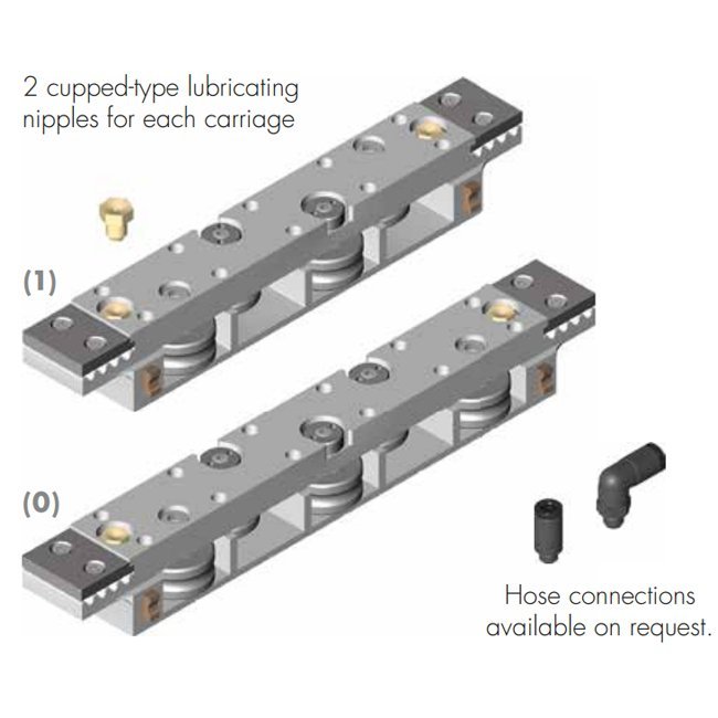 Carriage Support: The carriage runs on 5 rollers, which can be adjusted and serviced at each central servicing position. Two grease nipples on the carriage enable relubrication of the positioning system.