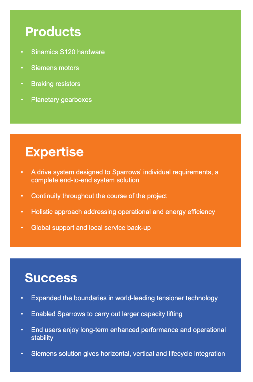 Integrating motors, drives and control equipment into a complete system has enabled Sparrows to carry out larger capacity lifting and thereby gain significant advantages in its marketplace – as well as help its end users enjoy long-term enhanced performance and operational stability. By adopting IDS for this project, Sparrows benefit in several ways: